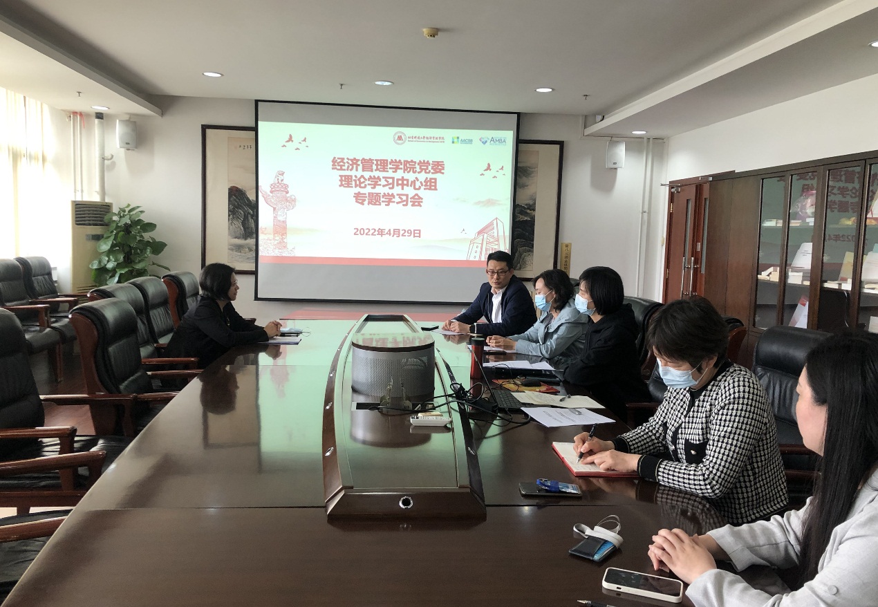 4月29日下午,经济管理学院党委在经管楼809召开党委理论中心组专题学习会,会议由学院党委书记武森主持并领学,全体中心组成员参加了学习会议。