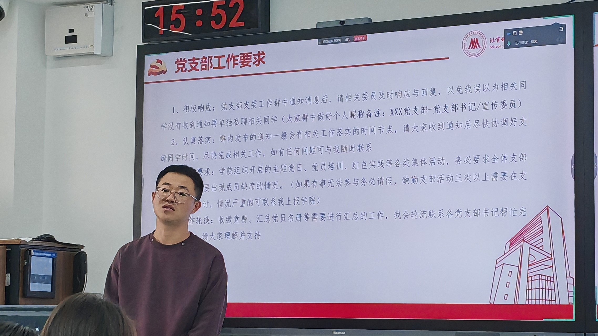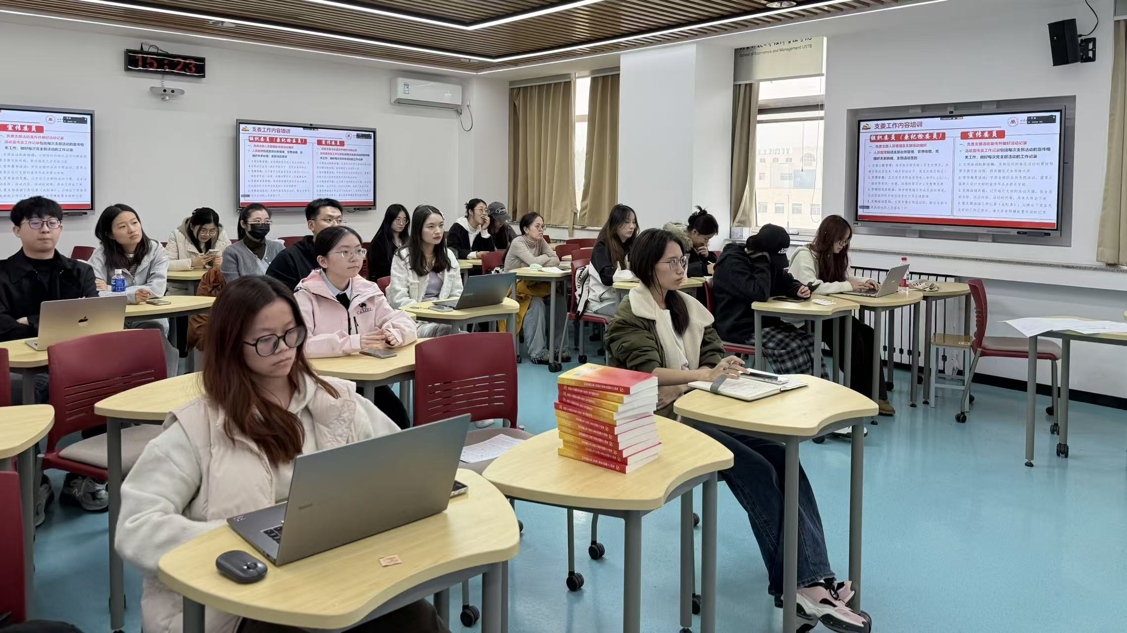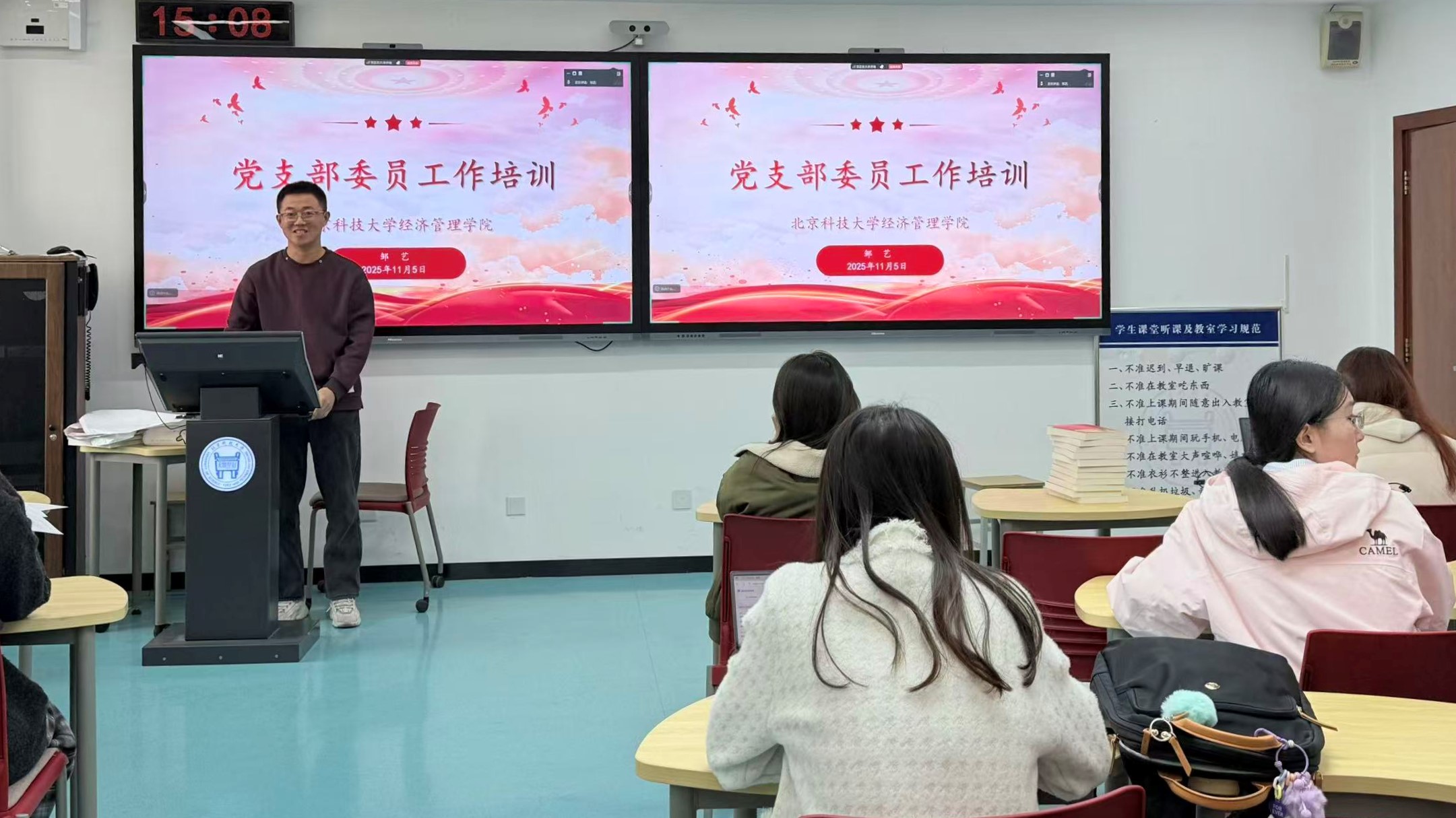 2025年11月5日15:00-16:30,北京科技大学经济管理学院在经管楼507组织开展了硕博党支部委员工作培训。本次培训由学院辅导员邹艺主持,各硕博党支部书记、组织委员(兼纪检委员)、宣传委员等支部委员线下集中参加。