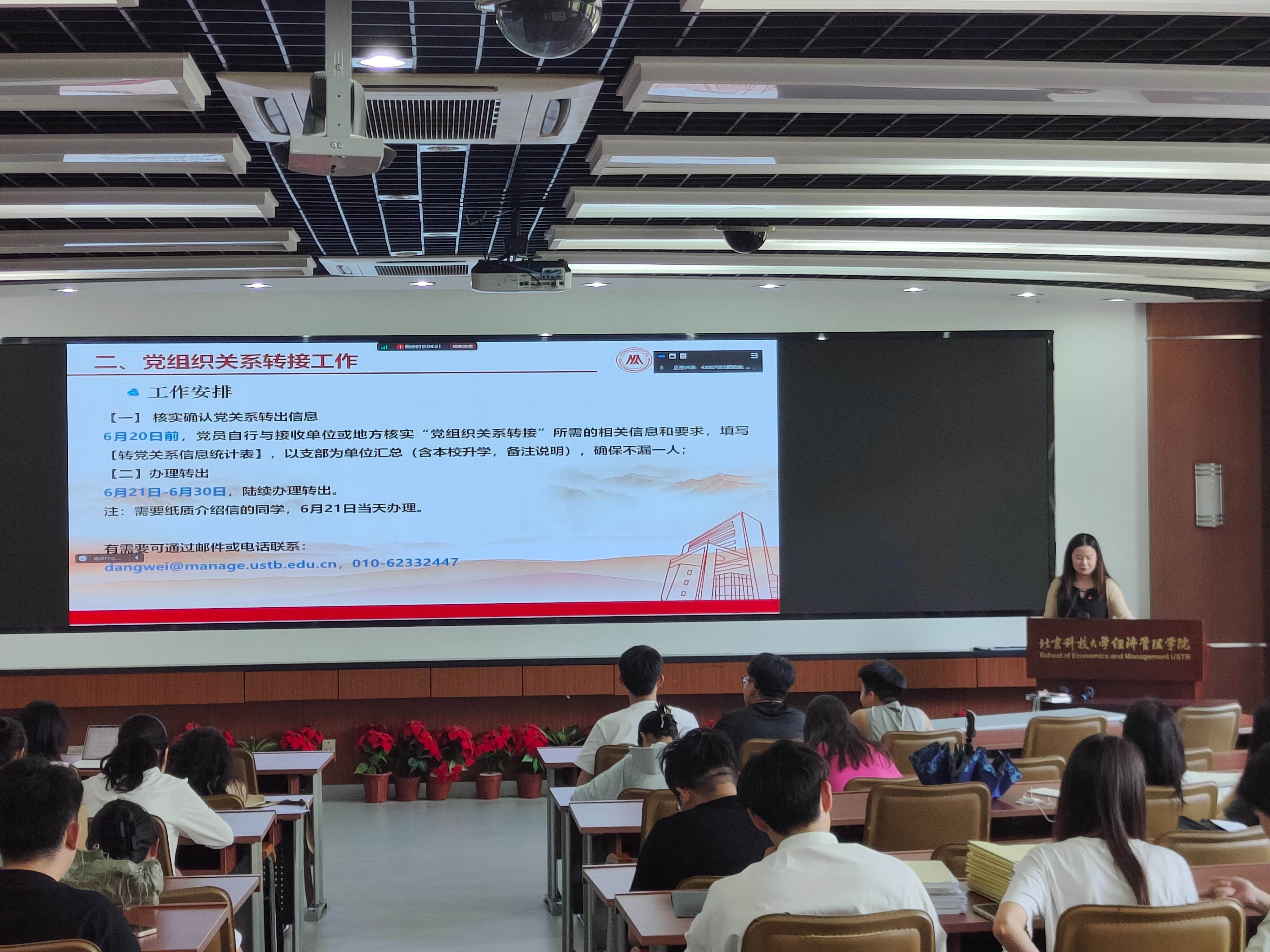 为顺利推进毕业生党组织关系转接,增强党员的政治觉悟和纪律意识,2024年6月12日下午15:30,经济管理学院2024届毕业生党员纪律教育暨组织关系转接培训大会在经管楼313召开。本次大会由学院党委秘书张晓佳主讲,2024届全体毕业生党员参加。