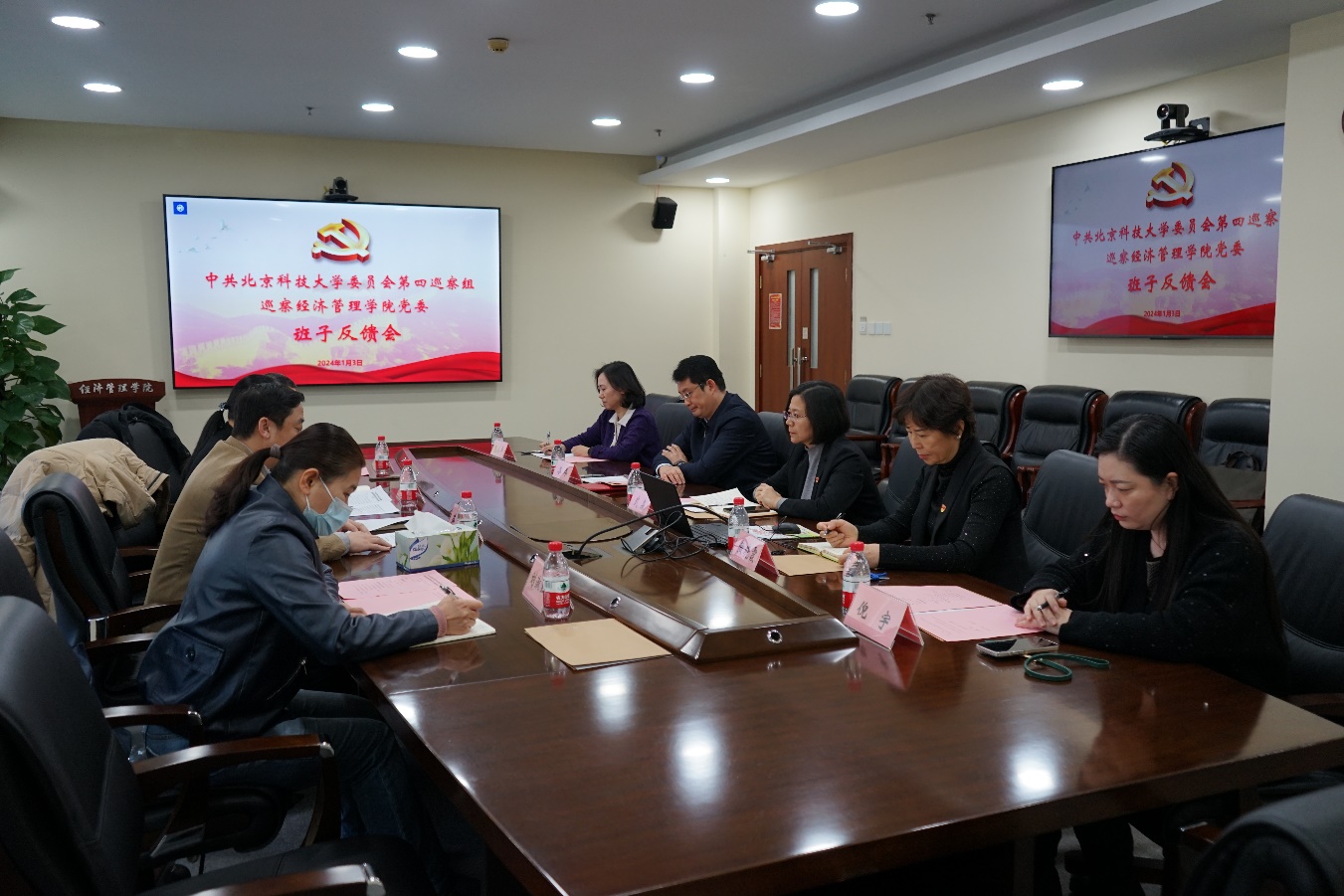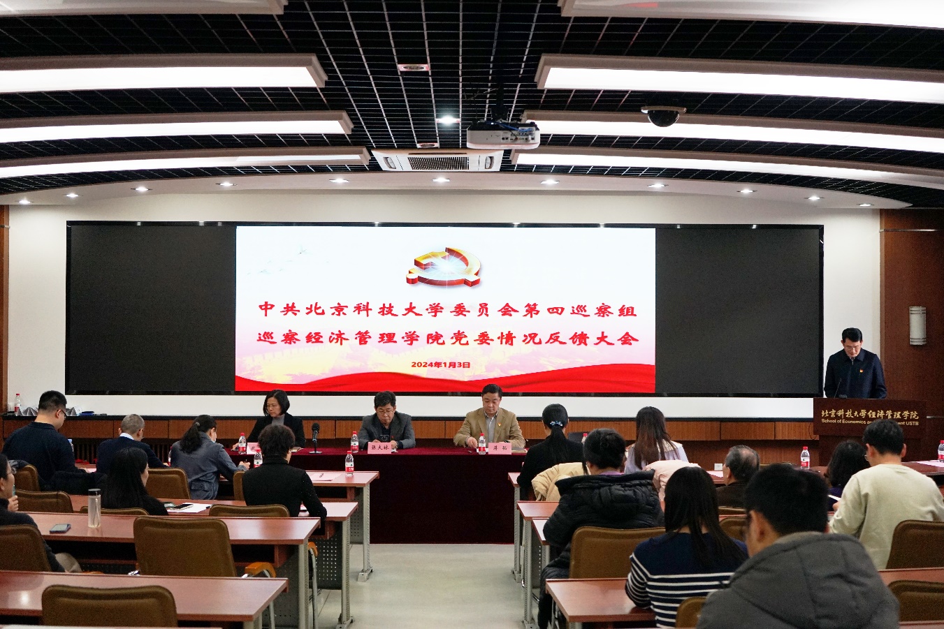 蒋韬代表巡察组宣读《中共北京科技大学委员会第四巡察组对经济管理学院党委巡察情况的反馈意见》,指出学院党委在强化政治引领、加强队伍建设等方面,对标党中央决策部署,教育部党组、北京市委及学校党委工作要求还存在一些不足,主要包括:贯彻落实党的路线方针政策和党中央重大决策部署,以及教育部党组、北京市委、学校党委工作要求不够扎实;落实全面从严治党主体责任和监督责任不够到位;落实新时代党的组织路线不够有力;建立落实巡视、巡察整改长效机制有差距。他代表巡察组对整改工作提出了意见建议:一是坚持深学细悟和党建引领,纵深推进高水平师资队伍建设;二是落实立德树人根本任务,加强意识形态阵地管理;三是压实主体责任,推进全面从严治党向纵深发展;四是加强干部队伍建设,推进基层党组织标准化、规范化建设;五是切实承担巡察整改政治责任,推动巡察整改成果运用落地见效。