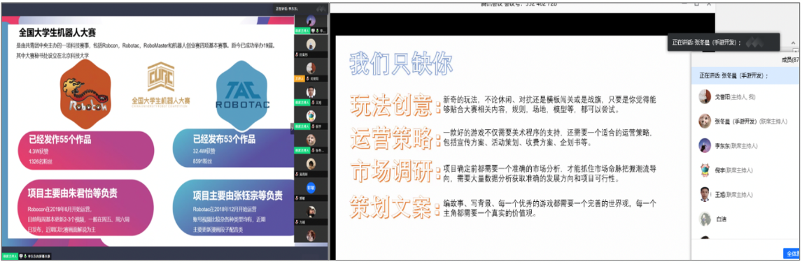 Li Dongdong, speaker of “TikTok” team, shared basics, positioning and development and future plans of their project. He explained the characteristics of the Tiktok platform , the target customers of their project, and their future work plan . He answered questions such as “why are they doing?”, “what are they doing?” and “how to make it?”. Zhang Dongchen, speaker of “Mobile Game Development” team, introduced their team by showing the existing models, programs and release channels. He introduced the rules of ROBOTAC through the video with specific list of talent needs. After their introduction, students exchanged ideas and formed their own project communication groups.