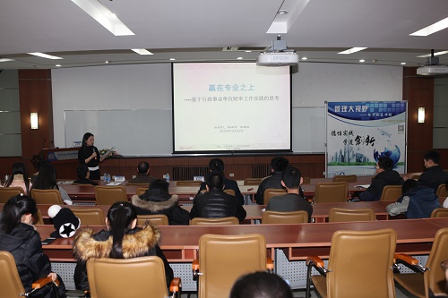 2015年12月22日,“管理大视野—经管校友讲坛”第十一讲在经管楼312教室举办。讲座主题为“赢在专业之上—基于行政事业单位财审工作实践的思考”。本期讲坛嘉宾为我院会计学专业本科91级、管研95级校友徐英国。徐英国校友曾任学院分团委书记、学生党支部书记、95级本科生辅导员等,现就职于国家工商总局,负责财务预算和审计监督工作,先后获得中央国家机关优秀青年、中央国家机关公务员考试面试考官、全国会计领军人才,曾两次记三等功。2009年以来,兼任上海财经大学国际工商管理学院、首都经贸大学会计学院等专硕校外导师。