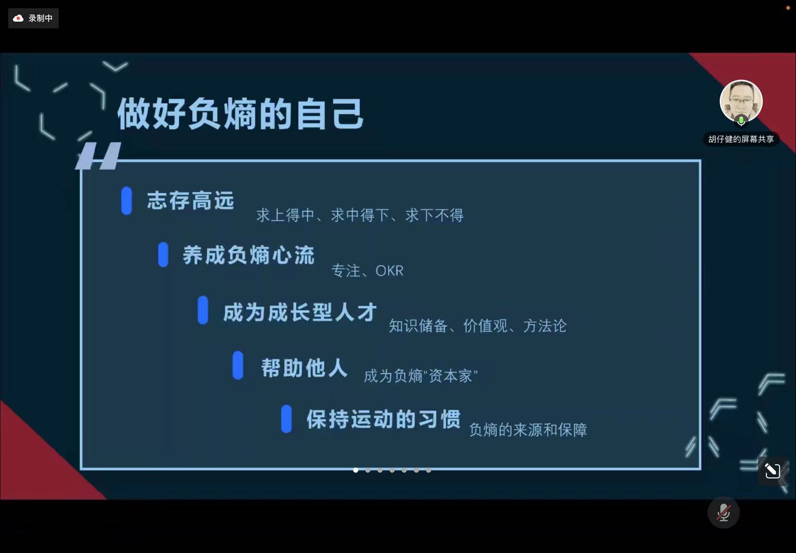 在互动环节中,胡仔健校友就熵增、熵减在生活中的运用和理解以及在大学生活中培养哪些核心能力等话题与同学们进行了交流,即使在线上也能够感受到大家的热情。
