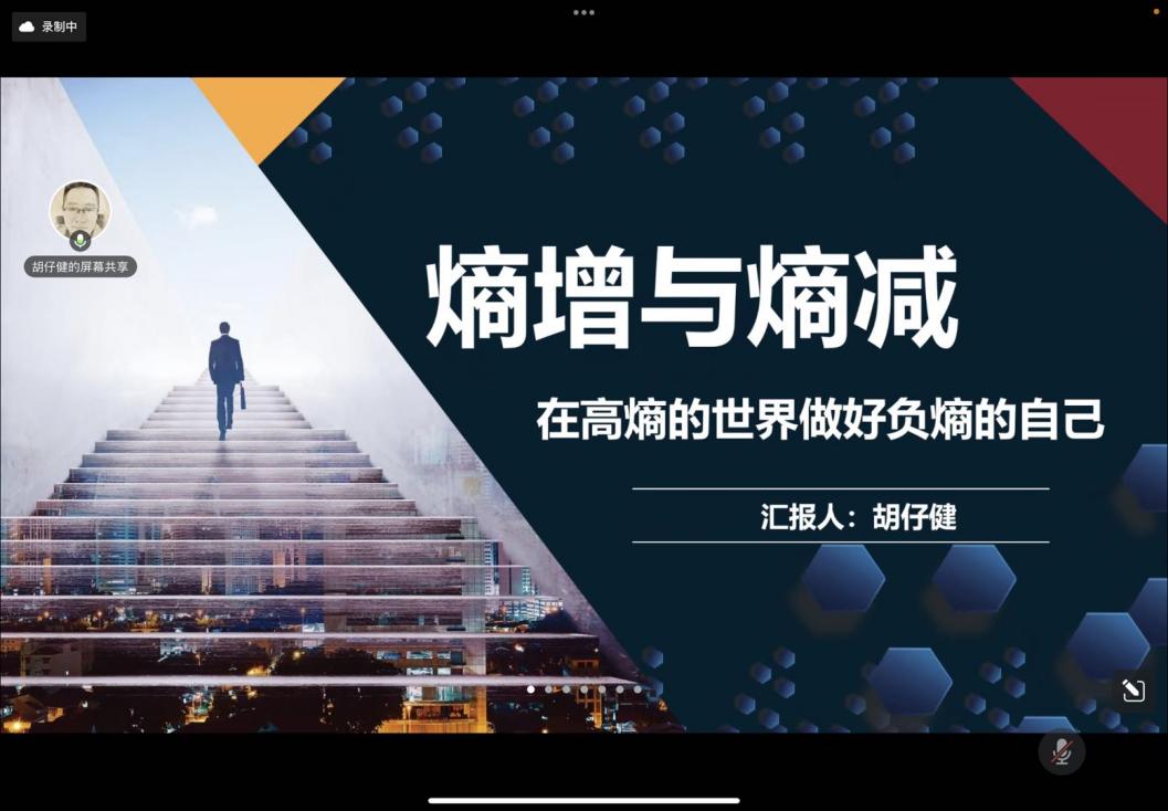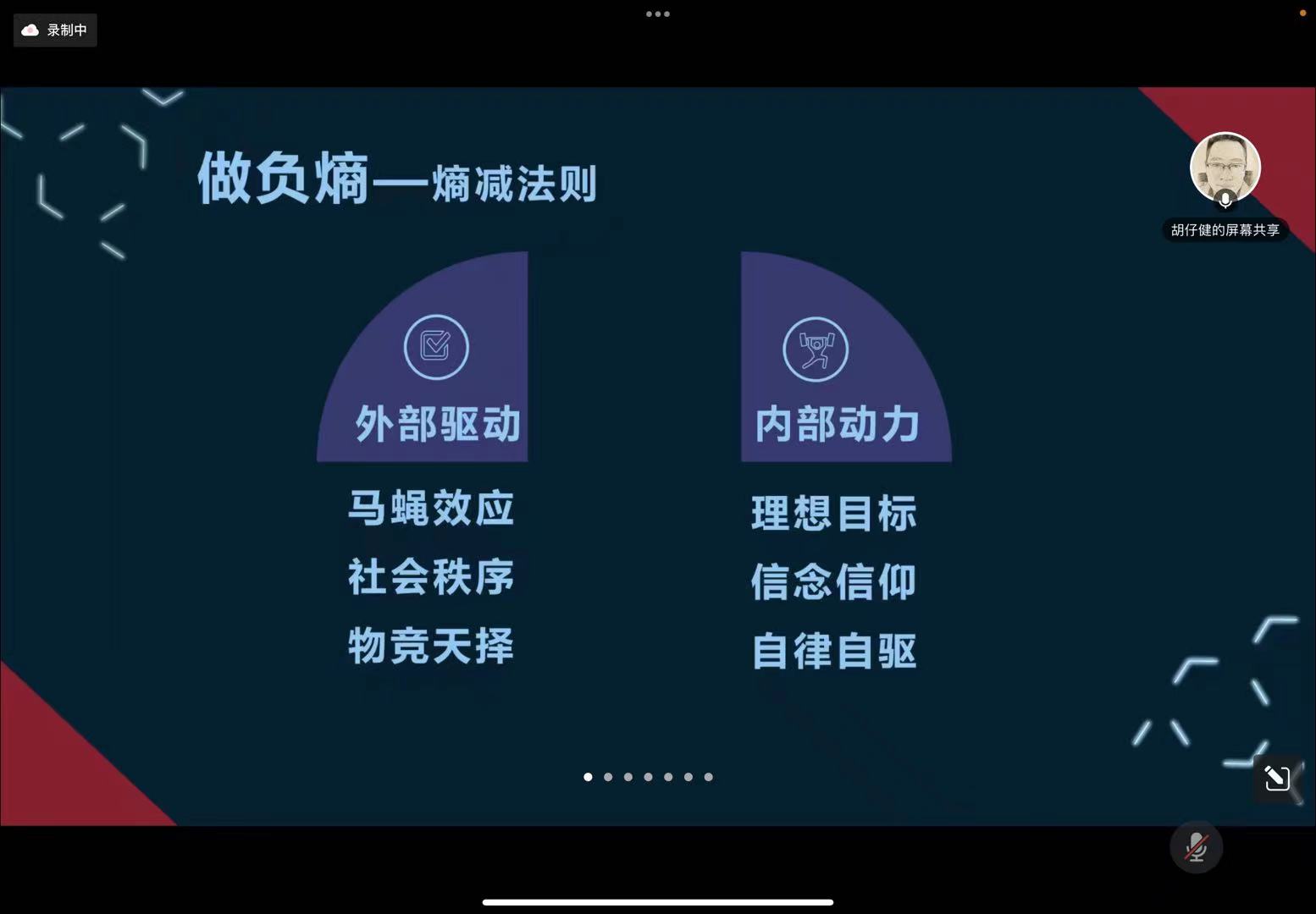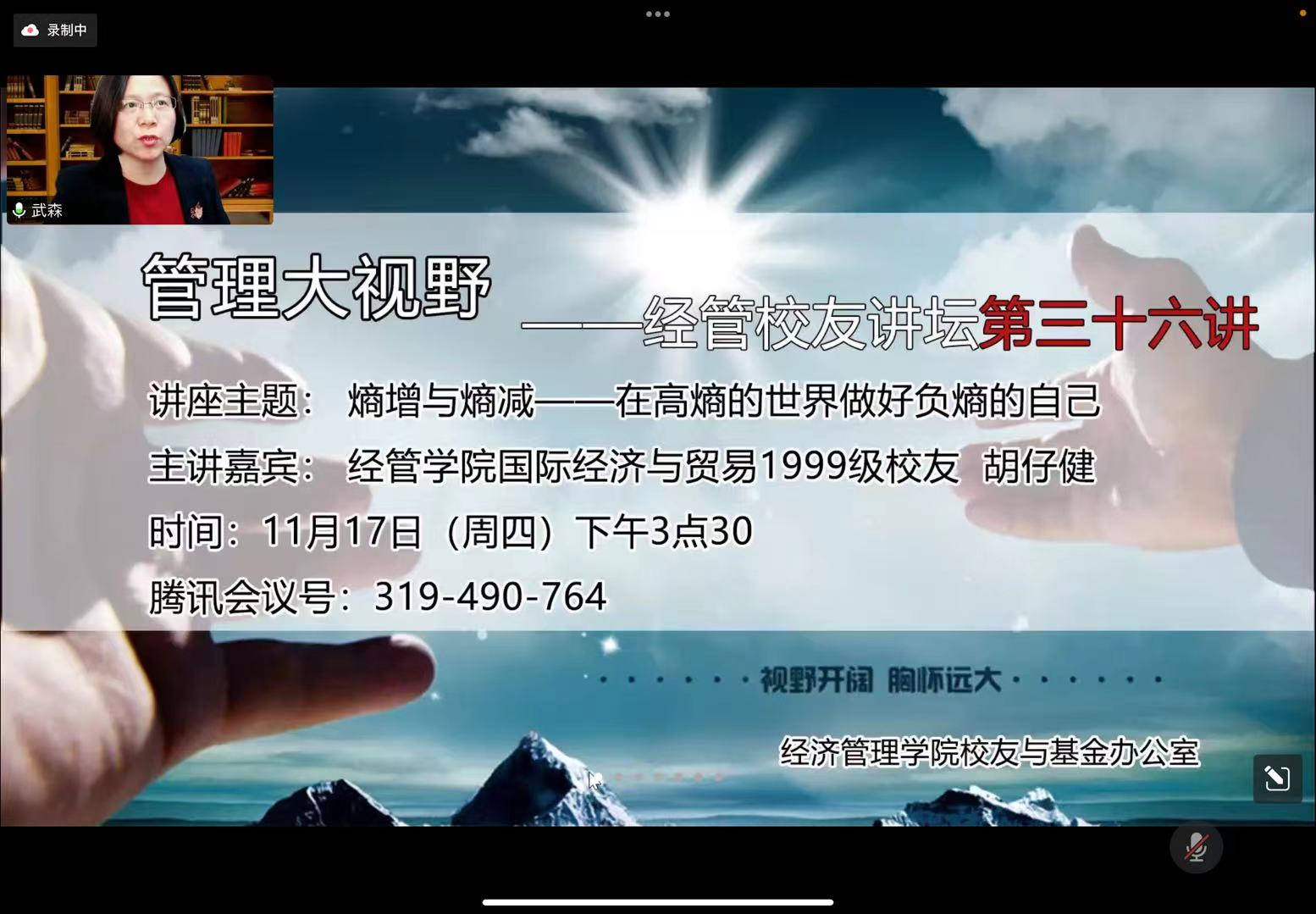 2022年11月17日15:30,经管学院国际经济与贸易1999级校友胡仔健带来的以“熵增与熵减——在高熵的世界做好负熵的自己”为主题的讲座以线上方式成功举行。