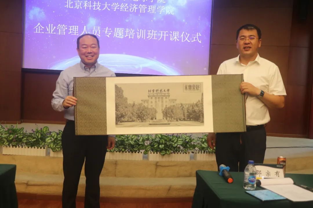 仪式最后,闫相斌副校长代表北京科技大学向中科星图股份有限公司赠送《北京科技大学全貌画卷》,邵宗有院长代表中科星图接收礼物,两位领导共同展示画卷。至此,开班仪式在与会嘉宾的掌声和希冀中圆满落幕。