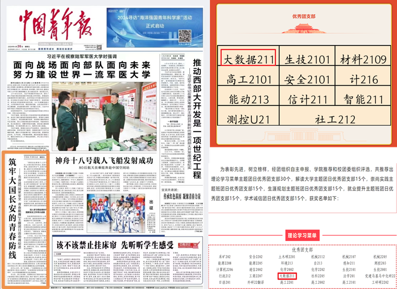 大数据211团支部两次获评“主题团日优秀团支部”荣誉称号,成功入选北京科技大学“团建工作样板支部创建项目”,创新开展的“国家安全,青春挺膺”主题团日活动获得《中国青年报》报道。