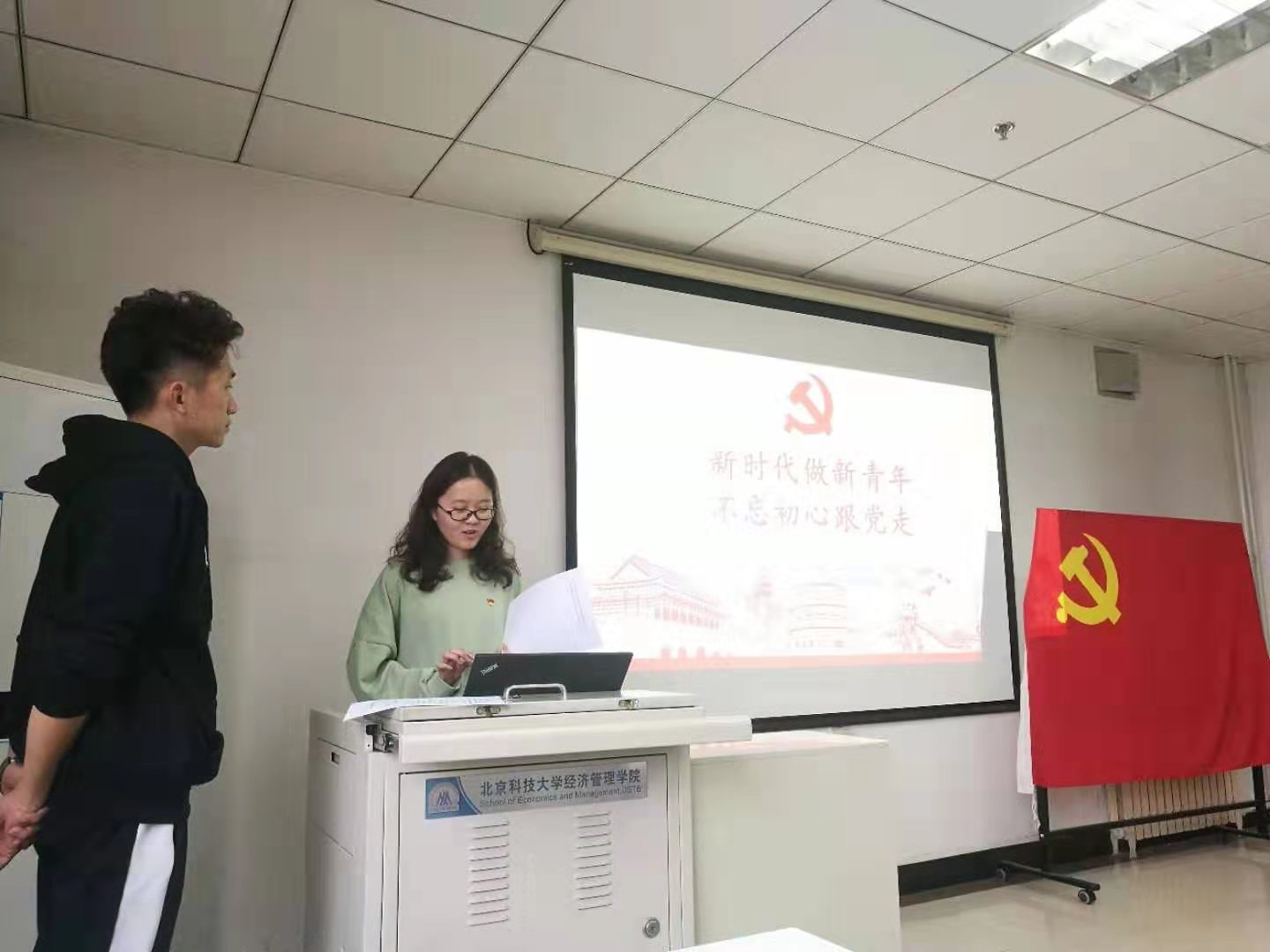 最后,路钊艺与孙茜两位预备党员,和大家交流了国庆联欢中的“黑科技”。在国庆联欢表演中,3290名群众演员举持光影屏,共同构成“飘动的五星红旗”,这是北京理工大学团队多年研发的数字表演与仿真高科技成果。接着回顾了中国科技的发展历程,从新中国成立,科技事业新的起点,到文化大革命,科技事业遭受重创,再迎来改革开放新的春天,到如今的科教兴国,面向未来,中国科技前进的步伐未曾停歇。在未来,中国科技要实现“三步走”战略目标,坚持双轮驱动,构建一个体系,推动六大转变,不断造福人类。