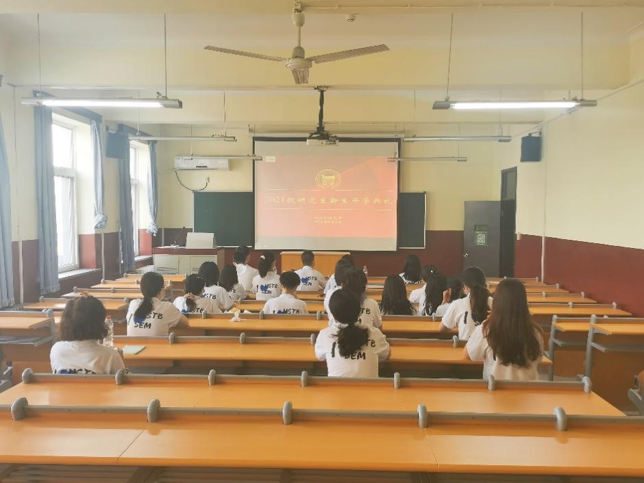 9月3日8:30,产经国贸研21级24名研究生新生、班主任白冥老师、系主任冯梅老师和辅导员丁源老师在管庄校区教学楼211线上观看了北京科技大学2021级研究生新生开学典礼。典礼在庄严的国歌声中拉开序幕,产经国贸21级研究生新生起立唱国歌。