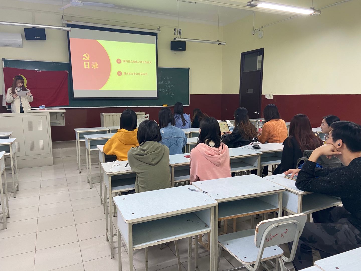 会议进行第一项内容,由辅导员李响向支部党员介绍纵向党支部成立的背景及意义,李响同志指出,研究生纵向党支部的成立有助于保证研究生党建工作的传承和支部文化的建设,发挥好党支部书记的带头作用;有助于各支部紧密结合学科建设和人才培养开展党建工作,更好地发挥党建工作的引领作用;有助于加强师生联动,各年级党员交流,发挥好导师的指导作用,加强党支部的凝聚力和战斗力。