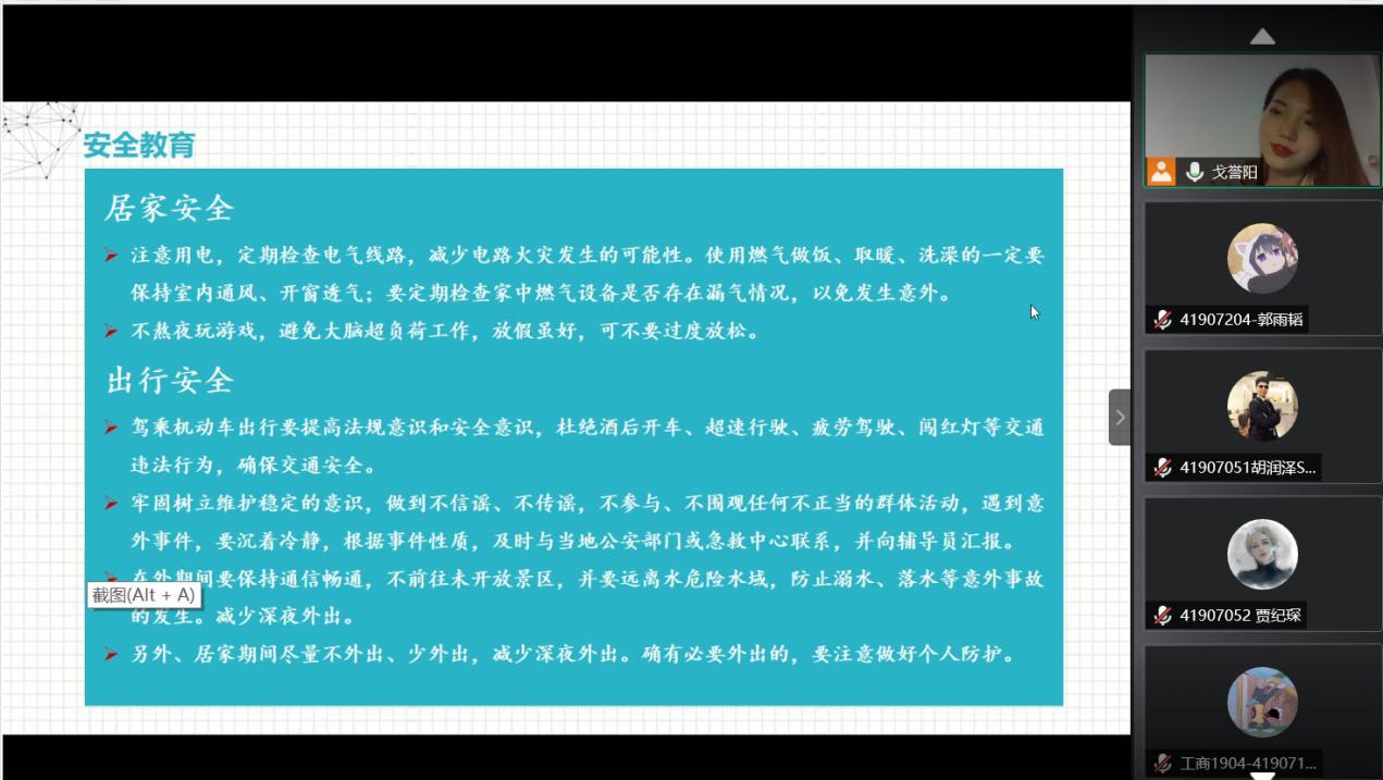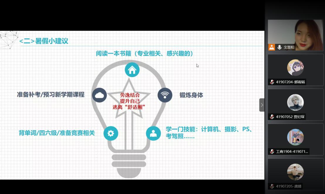 6月26日晚,经管学院本科19级工商管理类在线上召开了“假期安排·安全教育·启航大二”主题年级会,会议由辅导员戈誉阳主持开展,全体工商管理类学生参会。本次会议内容包括宣布暑假安排、进行安全教育,同时为即将踏入大二年级的同学们提出一些建议,帮助同学们合理安排假期,为大二的学习和生活做准备。