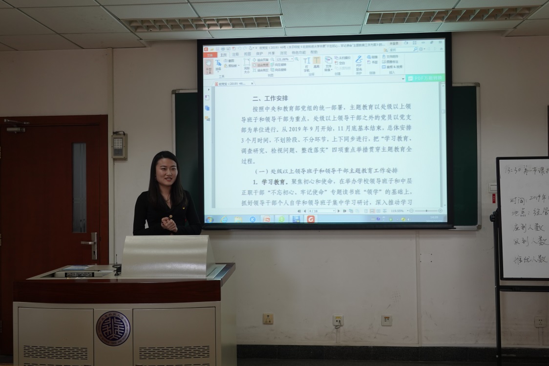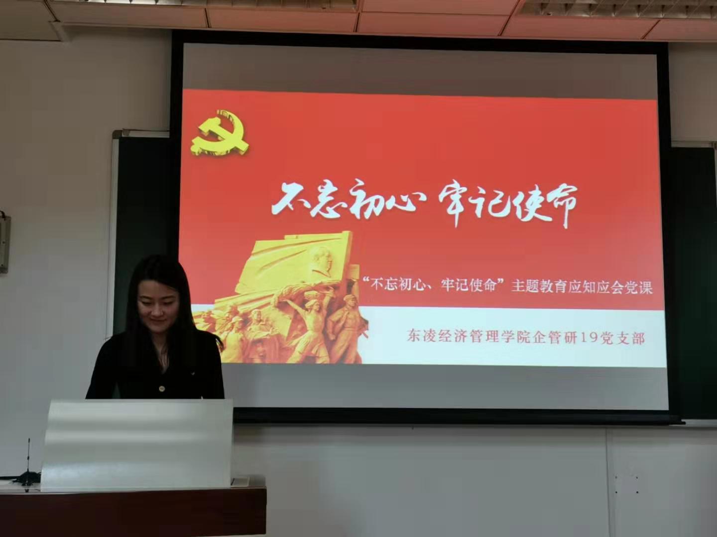 为响应在全党开展“不忘初心、牢记使命”主题教育的号召,根据“不忘初心、牢记使命”主题教育工作方案,10月25日下午,东凌经济管理学院企管研19党支部于管楼504开展“不忘初心、牢记使命”主题教育应知应会党课,并邀请2019级研究生辅导员李响为全体支部成员进行讲解。