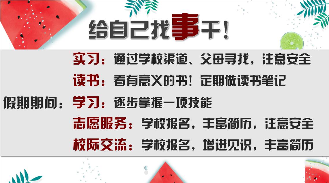 接下来是年级会第三项。张老师为同学们布置了三项暑假作业:完成一份学期总结,完善自己的简历,以及撰写大二学年的规划,这分别象征着过去,现在和未来。同学们要从过去汲取经验,把握自己的成长历程,从现在起丰富自我,对未来做出规划,保持积极向上的阳光心态和充满勇往直前的不竭动力。