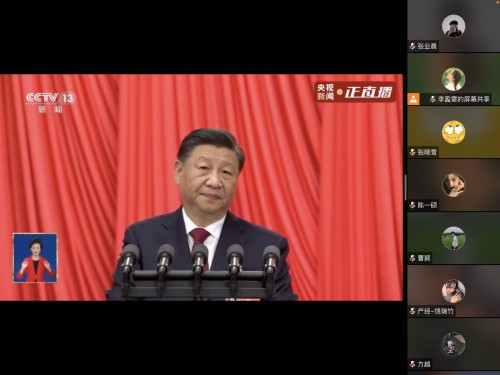 2022年10月16日上午10点,产经研党支部通过腾讯会议组织支部内同学线上观看二十大开幕,学习二十大报告内容。此次会议由产经研党支部组织委员李盈霏主持开展,参会人员包括党支部全体党员和入党积极分子。