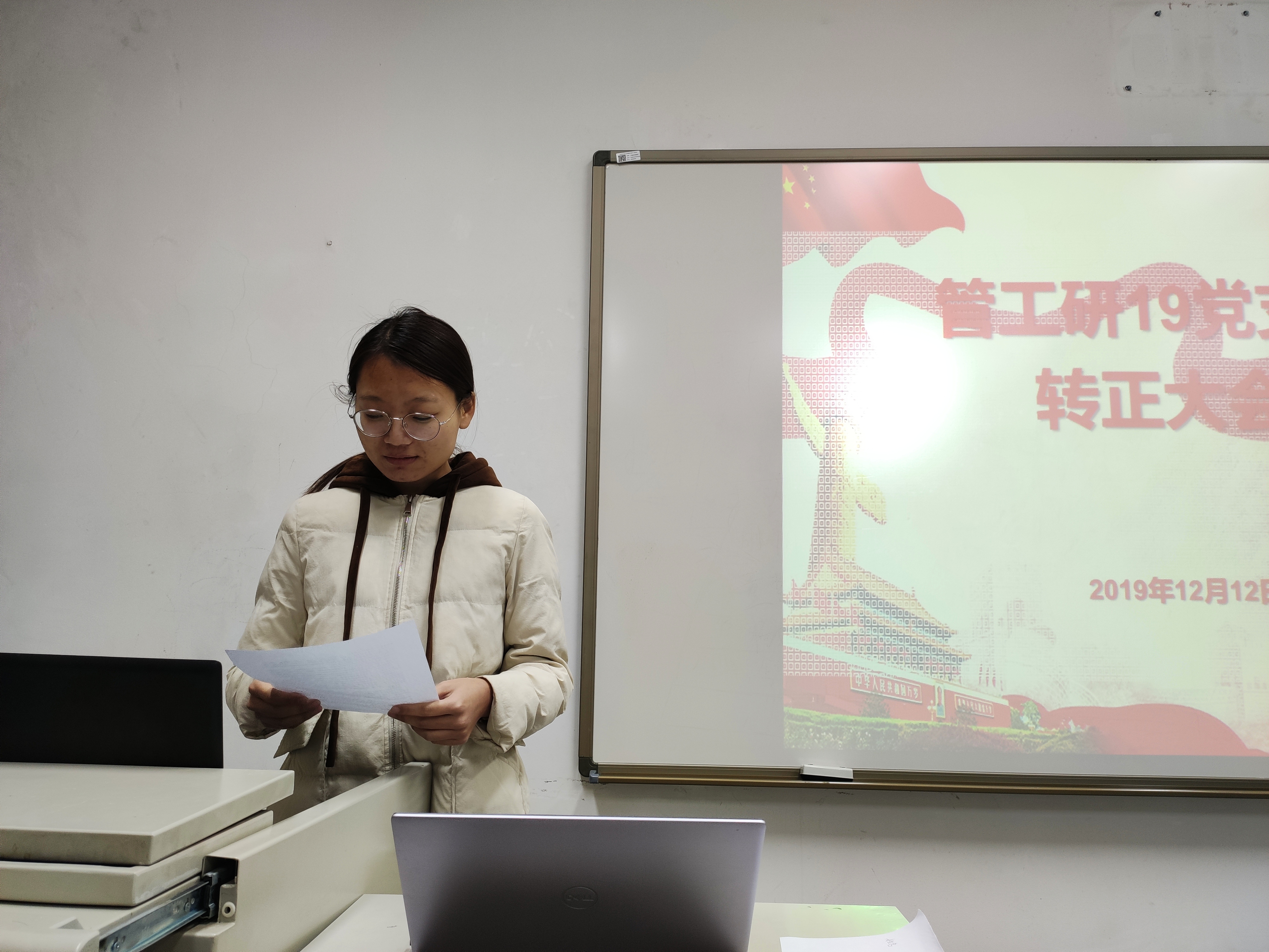 12月12日,东凌经济管理学院管工研19级党支部在管楼310顺利召开了中共预备党员转正大会暨“不忘初心、牢记使命”主题观影活动,党支部书记尹香婷主持本次活动。