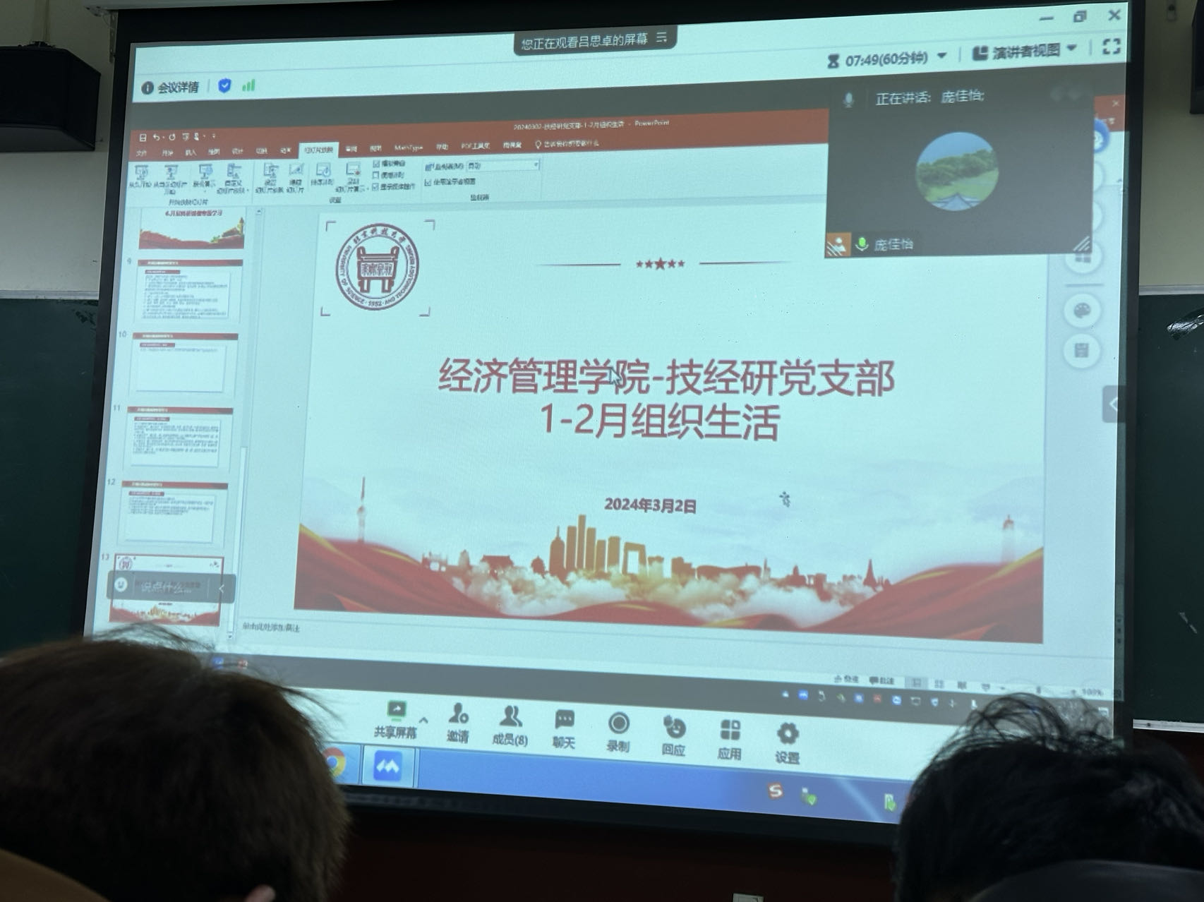 2024年3月2日20:00,经济管理学院技经研党支部顺利开展1-2月组织生活,本次组织生活于北京科技大学经管楼404以及管庄教学楼205举行,支部共有34人参与。本次组织生活的主题为集中理论学习,由技经研党支部书记吕思卓同志主讲。