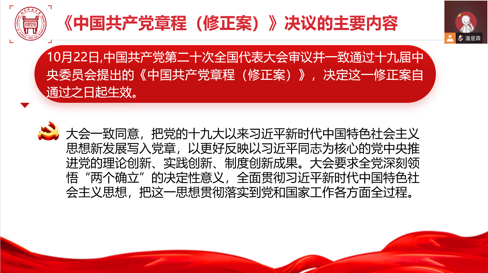 2022年11月18日19:30,经济管理学院管工研党支部开展了十月党支部的组织生活,因疫情防控原因,本次组织生活以线上会议的形式开展。支部党员35人参加,积极分子12人列席。