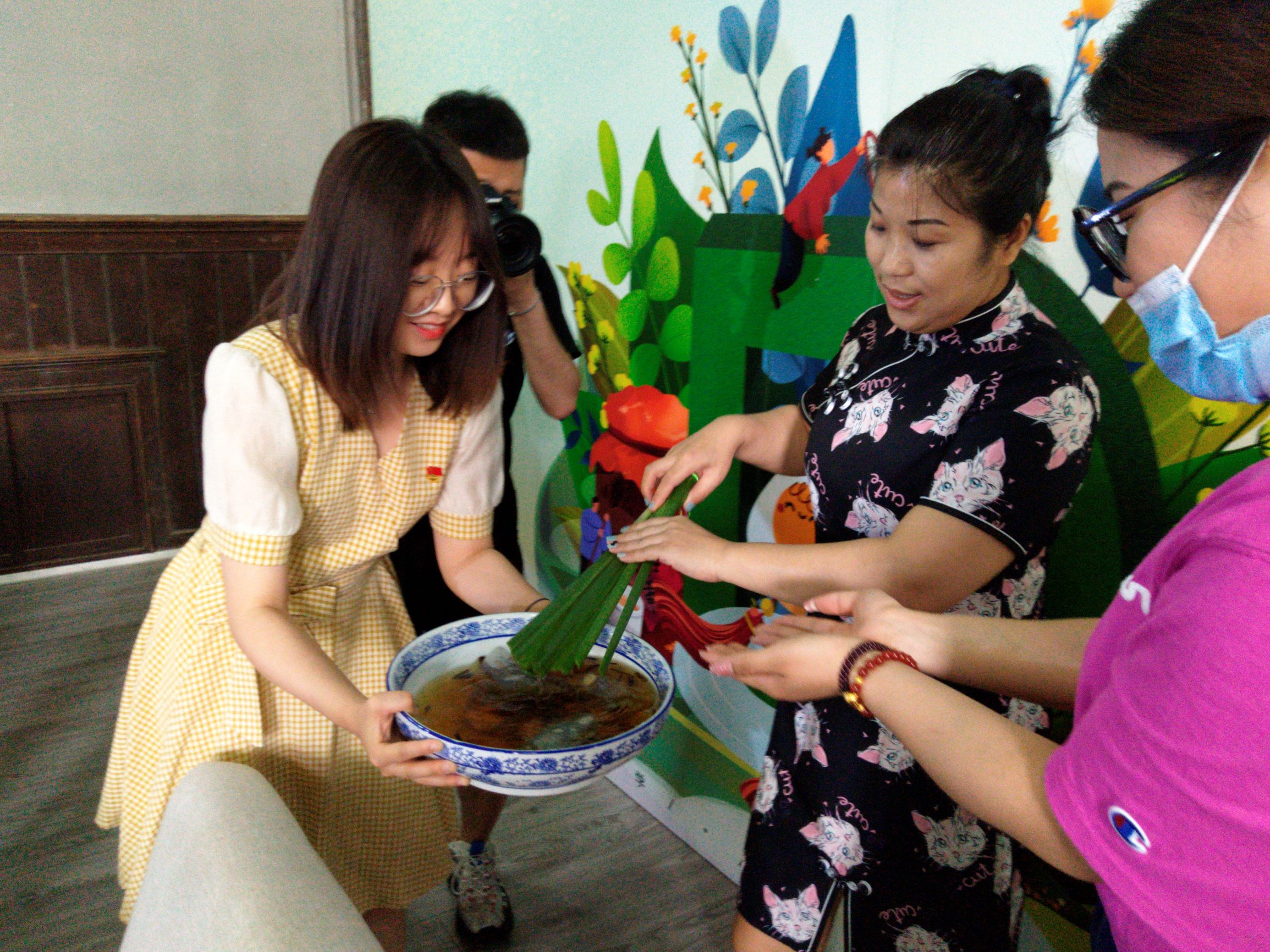 活动伊始是浴兰汤洗手环节。端午日浴兰是《大戴礼》记载的古俗,但其中的“兰”不是兰花,而是菊科的佩兰或草药,有香气,可煎水沐浴。活动主持人结合传统文化为大家讲解了端午节的来源与习俗后,党员们现场将兰汤点撒在老人们的手上送去祝福。