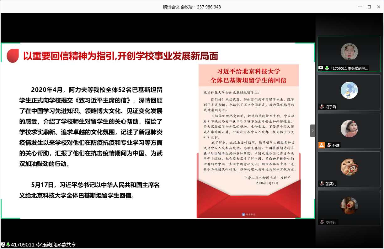 会议的第一部分,由王灏、李钰葳带领大家学习习总书记重要回信精神。在学习中,两位同学带领大家重温习主席给北京科技大学全体巴基斯坦留学生的回信,学习我校党委书记武贵龙、校长杨仁树就全面深入学习宣传贯彻总书记重要回信精神的部署与要求。