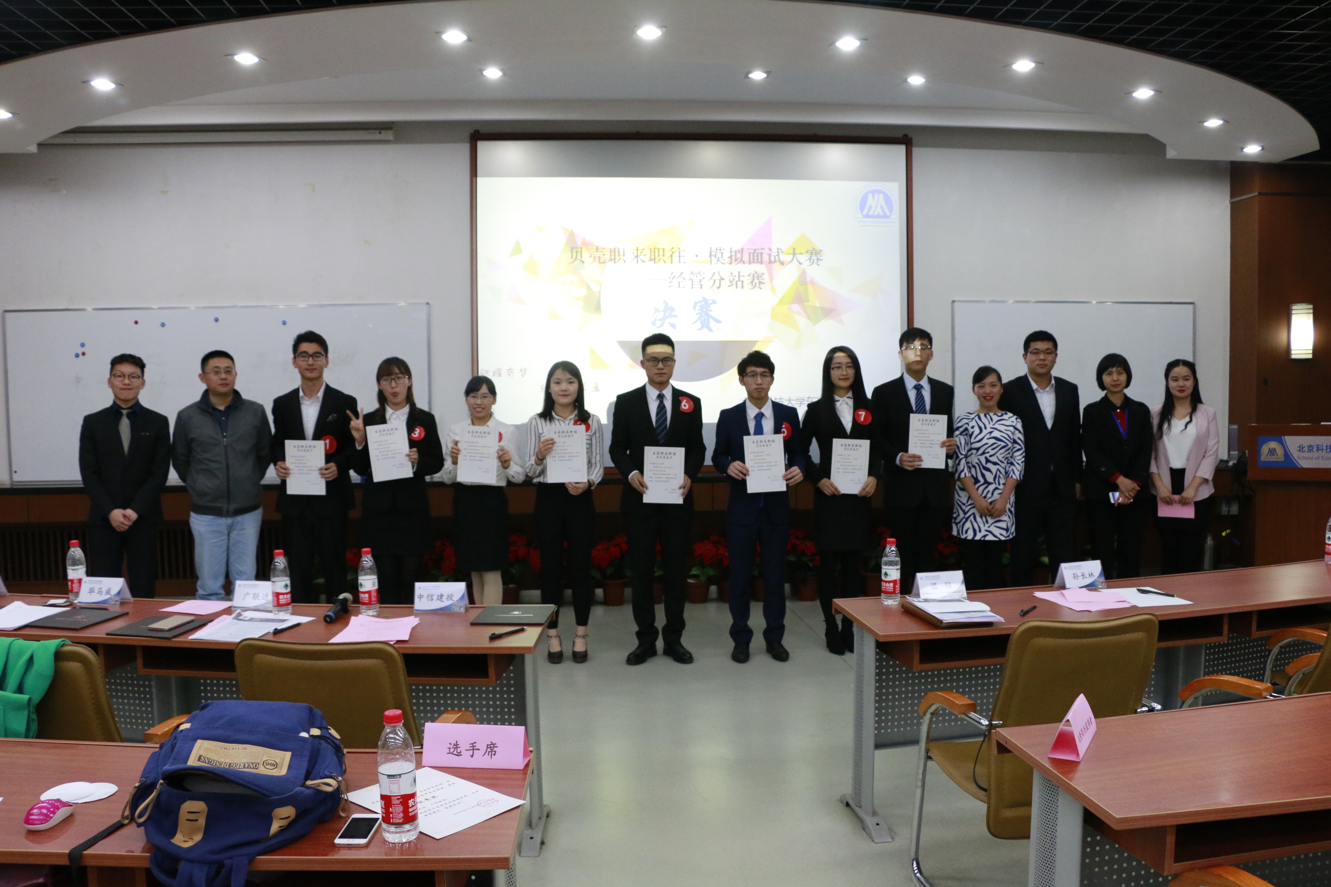 第九届模拟求职大赛经管分站赛的决赛于4月18日晚在经管楼313举行。担任本次比赛的企业评委有中信建投北京三环东路证券营业部总经理常文涛先生,广联达科技股份有限公司招聘经理王炯女士,毕马威华振会计师事务所校招负责人张景昱先生以及招商银行北京分行信用卡部主任黄灏鹏先生。学校就业指导中心主任孙长林和东凌经济管理学院党委副书记温雅出席活动,决赛由东凌经济管理学院就业专任教师张晓佳主持。