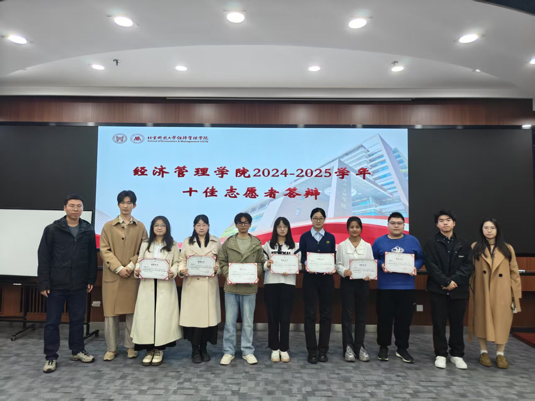 2025年10月27日,北京科技大学经济管理学院2024-2025学年“十佳志愿者”答辩会在经管楼313报告厅圆满落幕。经济管理学院学院2022级本科生辅导员许师旸、2023级本科生辅导员方天群、2024级本科辅导员王顺宇组成评审团,共同见证这场关于奉献与热忱的青春叙事。