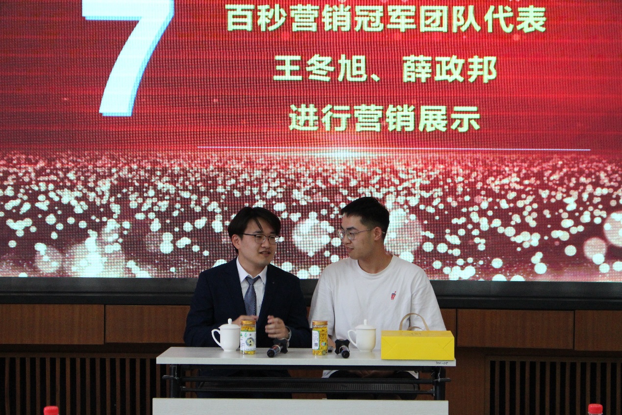 随后进行颁奖仪式,孙景宏、武森、陈雪松、蒋灵斌为获奖团队颁发奖杯和证书,对其在营销大赛中的优异表现表示肯定,激励同学们再接再厉,奋力前行。冠军团队代表杨凝发表感言,分享团队在参赛过程中的心路历程和收获。百秒营销冠军团队代表王冬旭、薛政邦进行精彩的营销展示,利用富有感染力的风格展现营销风采。