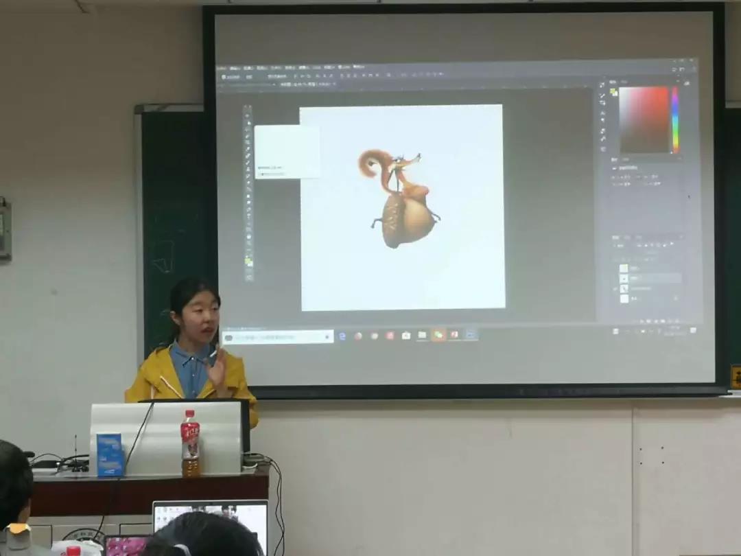 来自学生会宣传中心的崔葆洁首先为同学们带来PS具体操作的讲授。她首先为大家讲述了PS软件中常用工具的用途以及PS的操作概念,随后通过三个具体案例,分别对滤镜、蒙版、人脸修图等进行了逐步的详细讲解。同学们听得十分认真,并积极踊跃地进行尝试,把刚刚学到的知识运用地得心应手。