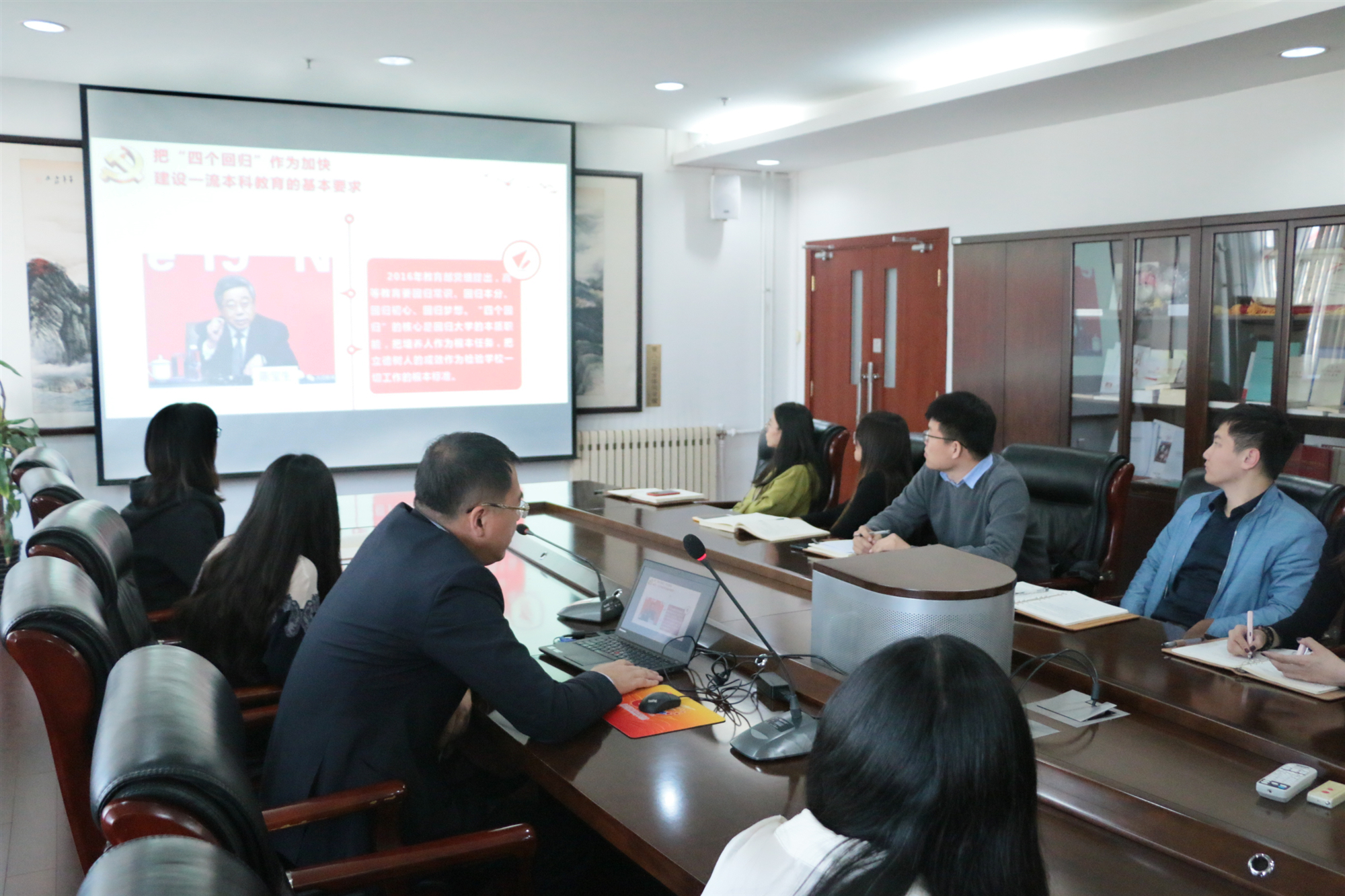 为全面深入开展“不忘初心,牢记使命”主题教育活动,激励辅导员队伍自觉增强政治担当、历史担当、责任担当,东凌经济管理学院院长闫相斌于10月18日下午3点在经管楼809,以《教育报国守初心,办好中国特色社会主义大学》为题讲授了一堂生动的党课。学院党委副书记倪宇、学工办全体辅导员参加。闫相斌在授课中紧紧围绕“不忘初心、牢记使命”主题教育总要求,从四个方面进行了深入解读。