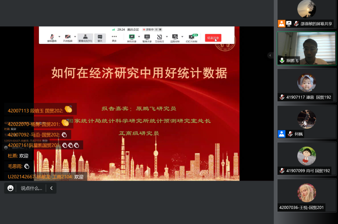 在近两个小时的论坛中,首先,原鹏飞研究员介绍了在科学研究中用好统计数据的重要性,对统计分析、查找数据、方法选择、数据计算和得出结论五个环节中数据的重要作用进行了阐释,并在此基础上进一步讲解了掌握数据资源的常用方法,以及如何利用数据和模型分析经济问题背后的深层次含义。其次,原鹏飞研究员强调了正确使用数据的必要性,并举例说明了数据使用不当或用错的后果,叮嘱同学们在学术研究中一定要重视数据采集和使用数据的规范性。最后,原鹏飞研究员指出,在大数据时代,必须要了解相关统计数据的分类标准、调查范围和调查方法,才能准确把握统计指标的内涵。
