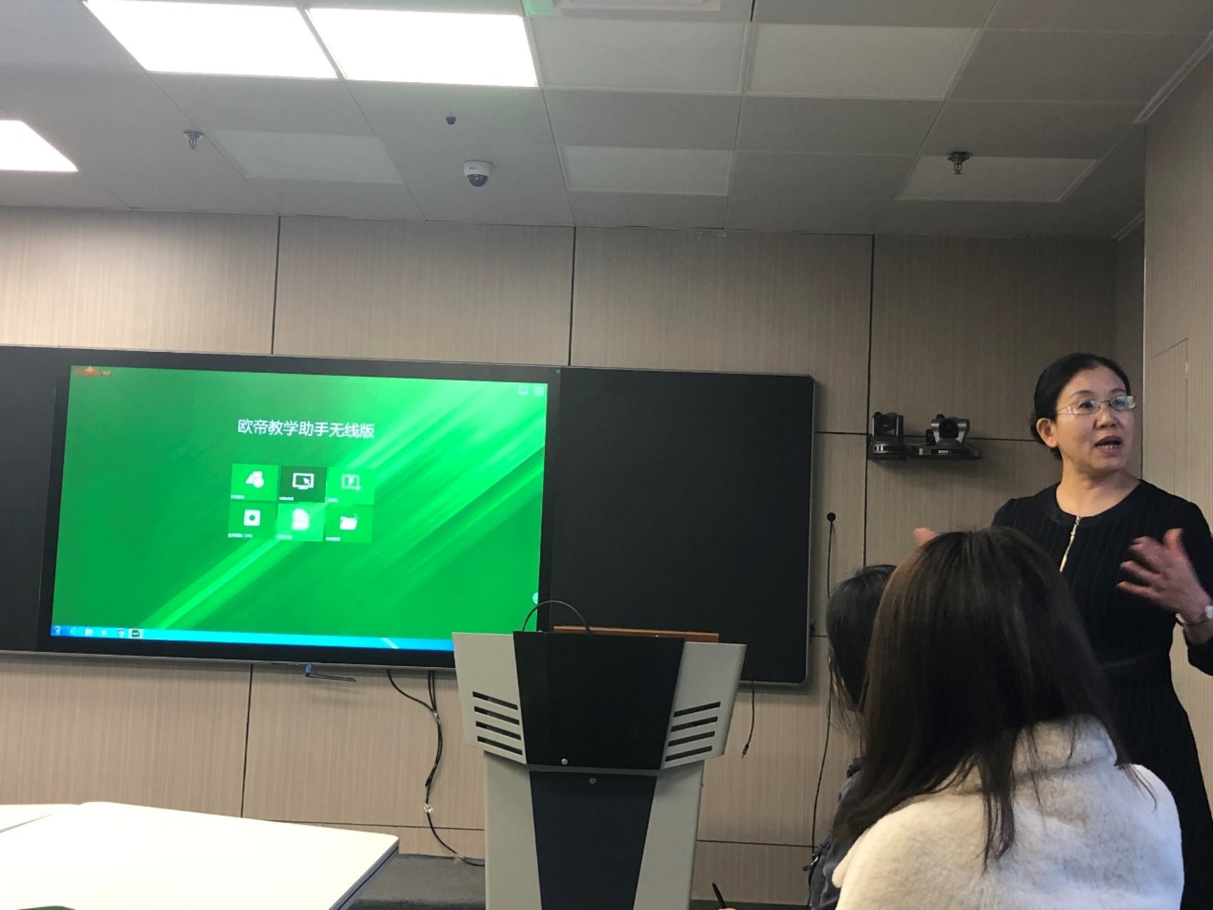 销售部褚蓄经理为师生们讲述了超星的发展历史,以及院士走廊的故事,使同学们进一步了解了互联网+背景下的教育发展新模式。产品部宋瑛经理在超星智慧教室用实际案例向师生们生动展示了一平三端的应用场景,同学们也纷纷体验、对比、分享了现代化教学模式与传统教学模式的不同感受。