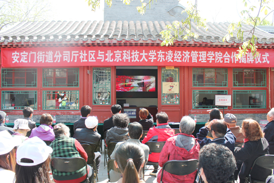 2013年4月25日上午九点半,北京科技大学东凌经济管理学院阳光志愿者协会与东城区安定门街道分司厅社区(580社区服务中心)合作揭牌仪式于580社区成功举行。580社区的创建宗旨是为孤寡老人和流动人口服务,照顾孤寡老人、为流动人口在京创业以及生活提供必要的帮助和便利。此次仪式的与会人员有分司厅社区书记王玉莲,街道办事处副主任孙彤,街道办事处工会主席周义峰,街道办事处团委书记张传峡,街道办事处宣传部部长佟彤,街道办事处副书记吴伟国,东凌经管学院团委书记李鹏,青年志愿者协会主席齐岭以及近二十位孤寡老人和志愿者。