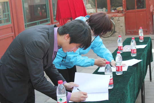 齐岭主席发言完毕后,揭牌仪式正式开始。团委书记李鹏上台对580社区的各位居民及领导作出郑重保证:在今后的活动中,北京科技大学东凌经济管理学院必将全心全意,派高素质高品德的志愿者为社区提供高质量的服务。紧接着由580社区书记王玉莲发表演讲,向志愿者们仔细诠释580我帮您社区设立的宗旨,对未来的展望以及对于和北科青协今后的合作活动的殷殷期待!社区书记讲话结束后,团委书记李鹏与其共同签署了合作协议。接着,李鹏老师与社区办事处副书记吴伟国一起揭开“北科志愿者实践基地”标牌。随后,社区工作人员播放了一段关于580社区服务中心自创立以来的感人故事以及对北京科技大学的简介视频。最后,东凌经济管理学院青年志愿者协会与安定门街道分司社区(580社区服务中心)合作揭牌仪式圆满结束!