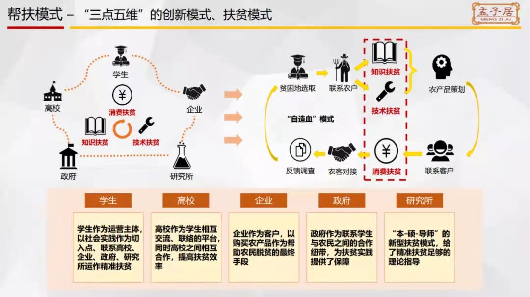 杨国庆学长首先分享了“孟子居”创业团队的创办历史和突出的荣誉事迹,孟子居创业团队成立于2015年3月,团队扎根于北京科技大学,通过建立可持续的农产品电商扶贫运营模式,在经济和知识双方面帮扶贫困地区。结合孟子居创业实践经历和扶贫案例,杨国庆学长分享了创新创业中的思政培训与实践融合的经验,打造“三点五维”的创新扶贫模式,有机组织结合高校、学生、企业、政府、研究所五类主体,实现知识扶贫、消费扶贫、技术扶贫,助力国家精准扶贫、乡村振兴政策。