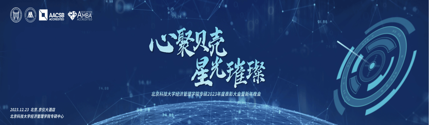 旧辞新至,万物安生。2023年12月23日,“心聚贝壳 星光璀璨”——北京科技大学经济管理学院专硕2023年度表彰大会暨新年晚会于北京京仪大酒店隆重举行。北京科技大学经济管理学院党委书记武森,副院长范小华、黄晓霞及学院教师代表、2022级和2023级专硕学生、校友代表、兄弟院校联合会主席及主席团成员、晚会赞助商近三百人参加了本次晚会,师生齐聚一堂,共同描绘美好的2024年。