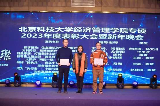 晚会现场,为过去一年学校取得的各项荣誉以及22级各位优秀学生进行了表彰。2023年同学们在各种团体竞赛中取得佳绩:九篇MBA管理案例收录至中国管理案例共享中心案例库,其中三篇荣获“百优案例”;在第十四届、十五届“尖烽时刻”全国模拟大赛总决赛中,荣获MBA/研究生组全国二等奖、最佳上镜奖、尖烽海报奖;第九届全国管理案例精英赛(2023)华北一区晋级赛取得了第四名和第五名的好成绩,并获得了全场“最有价值队员奖”;在第四届思政案例大赛中有三支队伍脱颖而出;首次参加的2023年中国研究生企业管理创新大赛同学取得二等奖和三等奖的成绩。此外,同学们还积极参与沙12挑战赛、北京MBA篮球超级联赛,第五届中国MBA羽毛球联赛、第四届亚太区商学院龙象海越野挑战赛等赛事,均取得优异成绩。一项项骄人的成绩不绝于耳、心潮澎湃;国家奖学金、优秀研究生干部、三好研究生、优秀联合会干部,一位位优秀个人神采飞扬、精神可嘉。丰硕的成果离不开全院老师和同学的共同努力,是他们以奉献铸就卓越,以勤奋诠释追求,以团结描绘梦想,用实际行动为北科大MBA争得荣誉、谱写北科MBA辉煌篇章!
