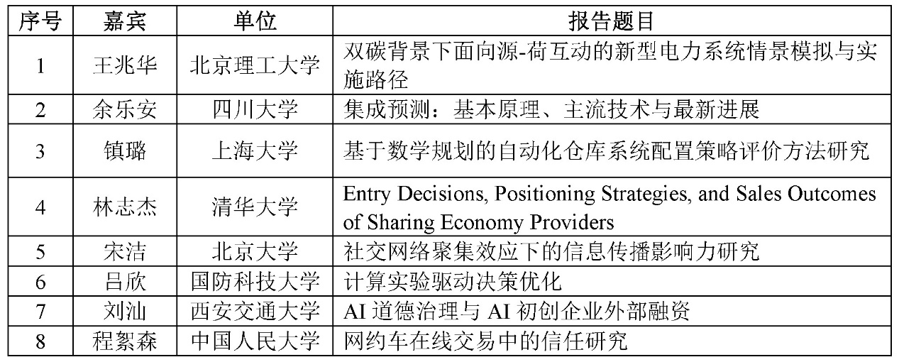预测与评价分论坛主任由北京科技大学教授/广东外语外贸大学校长闫相斌担任、副主任由四川大学商学院余乐安教授、北京科技大学经济管理学院院长谷炜教授担任。分论坛邀请的报告嘉宾包括北京理工大学管理与经济学院院长王兆华教授、四川大学商学院余乐安教授、上海大学管理学院院长镇璐教授、清华大学经济管理学院林志杰副教授、北京大学工学院党委书记宋洁教授、国防科技大学系统工程学院吕欣教授、西安交通大学管理学院副院长刘汕教授和中国人民大学信息学院程絮森教授。