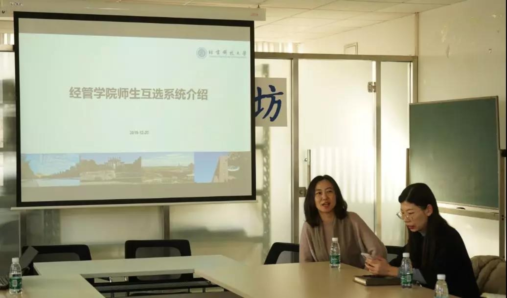 2019年12月20日北京科技大学教务处教学科科长耿悦杰、教学科赵环宇,以及学校土木与资源工程学院、冶金与生态工程学院、马克思主义学院、计算机与通信工程学院、文法学院、高等工程师学院、外国语学院、材料科学与工程学院、能源与环境工程学院、自动化学院、机械工程学院等其他兄弟学院的教务老师来东凌经济管理学院就本科生导师的师生互选系统进行了经验交流。我院教学副院长范小华、本科生教学办公室主任赵西爱参加了这次活动,学院实验信息中心副主任、管理科学与工程系教师金家华做了题为“经管学院师生互选系统介绍”的汇报。