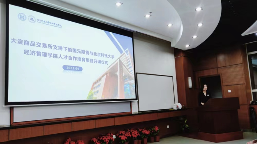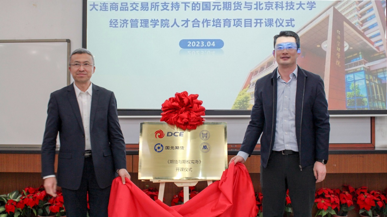 2023年4月19日19:30,大连商品交易所支持下的国元期货与北京科技大学经济管理学院人才合作培育项目开课仪式在经管楼313成功举办。国元期货董事长洪明,北京科技大学党委副书记、纪委书记戴井岗出席仪式并讲话。大连商品交易所研究中心总经理助理郭科、国元期货研究咨询部经理吴菁琛、国元投资管理(上海)有限公司副总经理孟令琳、北京科技大学经济管理学院院长谷炜、教务处副处长宋洪庆、经济管理学院金融工程系教师杨志明、学院金融工程系教师刘霞、学院团委书记李响出席此次开课仪式,同时参加的还有该人才合作培育项目的管理人员、老师和学员们。