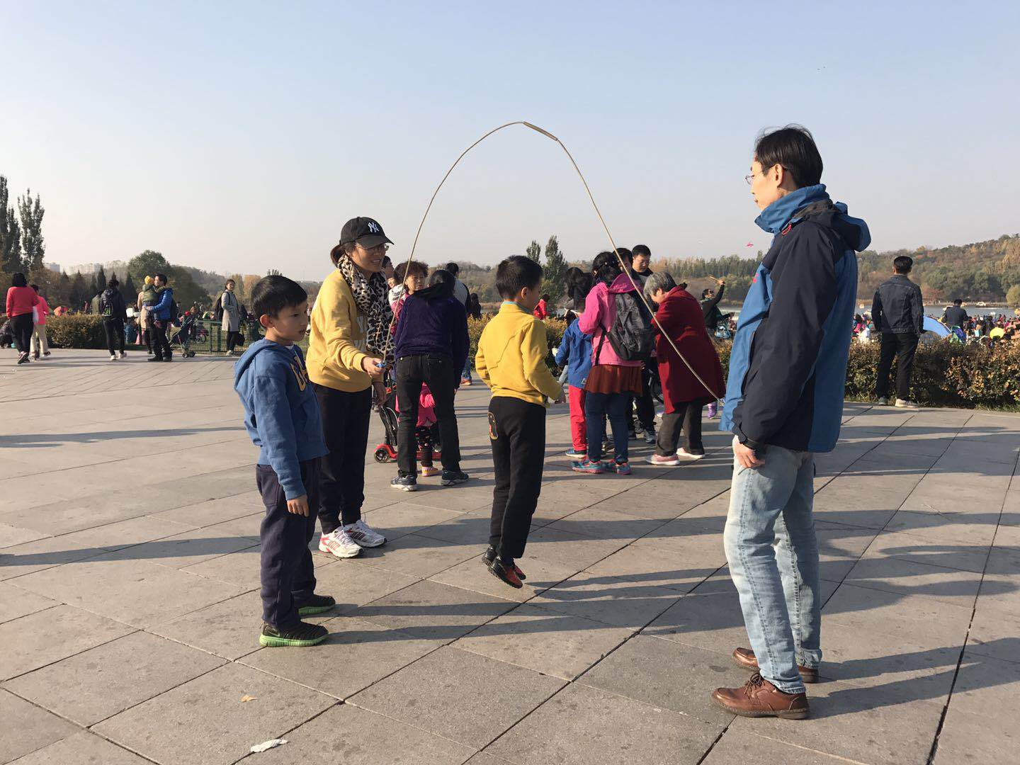 周末时光的奥林匹克公园里面人头攒动,老师们有的加入跑步队伍,5公里或者10公里,在奥森里面画一个完美的圆圈;有的三五一群边走边拍摄黄灿灿的美景;有的和小朋友们一起跳绳、踢毽。趁着北京好天气,老师们充分享受下午欢乐的时光。美丽的秋色,天清气朗,欢快的人群,热情奔放,洋溢在整片天空。