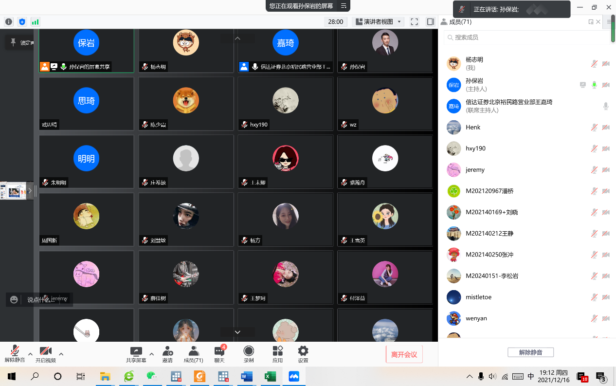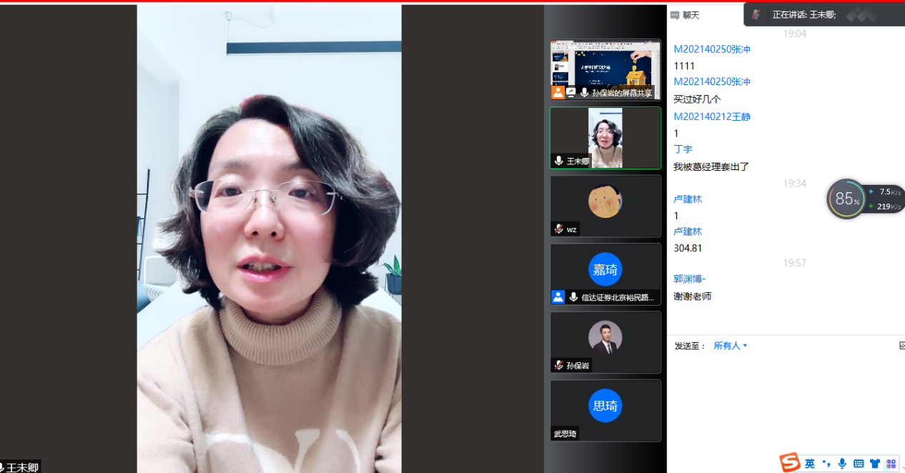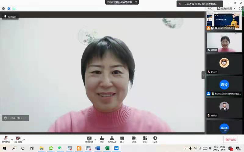 本次专题讲座由于受疫情的影响,采用的是线上、线下同步进行。本次活动主题是“大学生对投资理财的正确认识与中国资本市场未来的投资机会”。主讲人邀请了信达证券首席投资顾问孙保岩老师和王嘉琦老师,参与的师生70余名,包括本科生、研究生和MBA学生。此次讲座也邀请了学院副院长黄晓霞老师参与并致辞,金融工程系主任兼书记王未卿老师主持并总结发言。