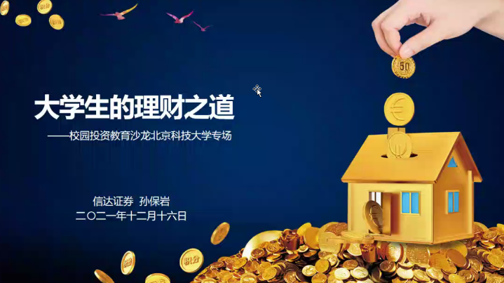 讲座首先让大学生了解学习了投资理财基础知识,如何选择适合大学生的的理财品种以及如何避免理财风险和误区。之后重点讲解了大学生跟风买基金和投资理财不赚钱怎么办,如何避免投资理财的5个误区。同时孙保岩老师也讲解了中国资本市场未来的投资机会,解读实现共同富裕的意义和未来进行投资理财规划和投资选择的建议。本次讲座同学们兴趣浓厚,互动交流热烈。