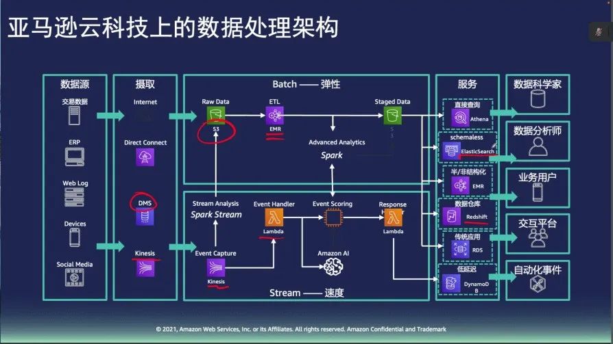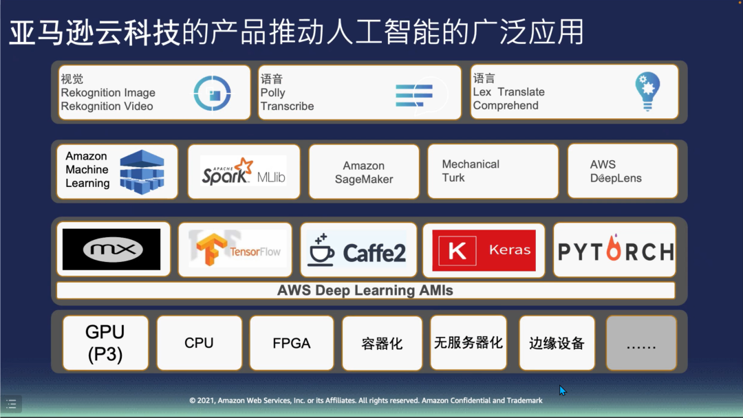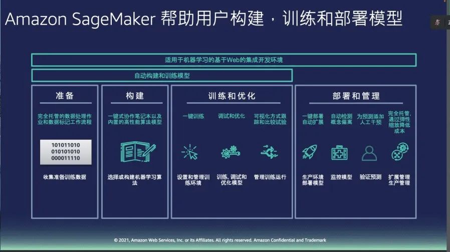 在存储方面,王老师介绍了功能强大的无服务器存储系统——亚马逊简单存储服务(Amazon Simple Storage Service),它能够以任何规模和格式存储数据,为所有分析需求提供极佳性能,实现无缝数据访问和数据统一治理。亚马逊云科技的使命,是让每个开发人员都掌握机器学习。王向炜老师向大家展示了亚马逊云科技产品如何通过一体式机器学习环境SageMaker帮助用户通过简易的方式构建、训练和部署模型,并以计算机视觉方面为例,介绍了其典型应用场景。