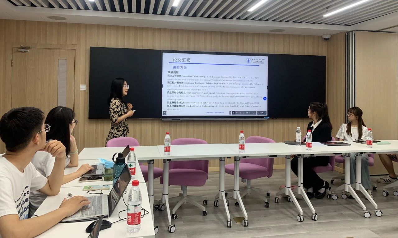 随后,活动进入到青年学者分享环节。北京航空航天大学经济管理学院副教授董雅楠报告了以第一作者身份发表在FT50期刊《Journal of Business Ethics》上的文章《Why is Crafting the Job Associated with Less Prosocial Reactions and More Social Undermining? The Role of Feelings of Relative Deprivation and Zero-Sum Mindset》。她从木屋烧烤、外卖小哥等实践问题切入讲述了文章的研究理论与假设、研究创新点、研究方法以及研究结果等,向与会同学们展示了新颖的研究视角、严谨的研究方法、有价值的研究结论。