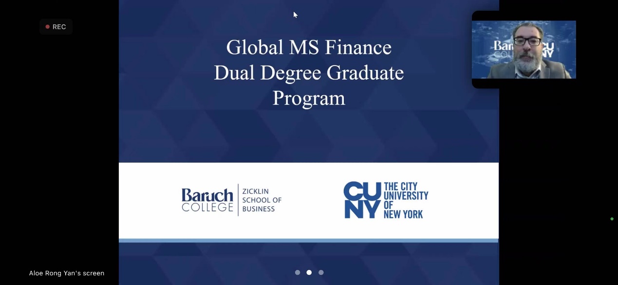 2024年1月8日晚,北京科技大学经济管理学院与纽约市立大学巴鲁克分校杰克林商学院合办的硕士双学位项目线上宣讲会顺利举办。宣讲会邀请杰克林商学院外联部主任Matt LePere教授和国际项目专员Aloe Rong Yan老师进行项目介绍。我院国际合作与交流办公室赵霞主任、王频频老师以及来自学硕和专硕项目的三十余名学生参与了此次宣讲会。