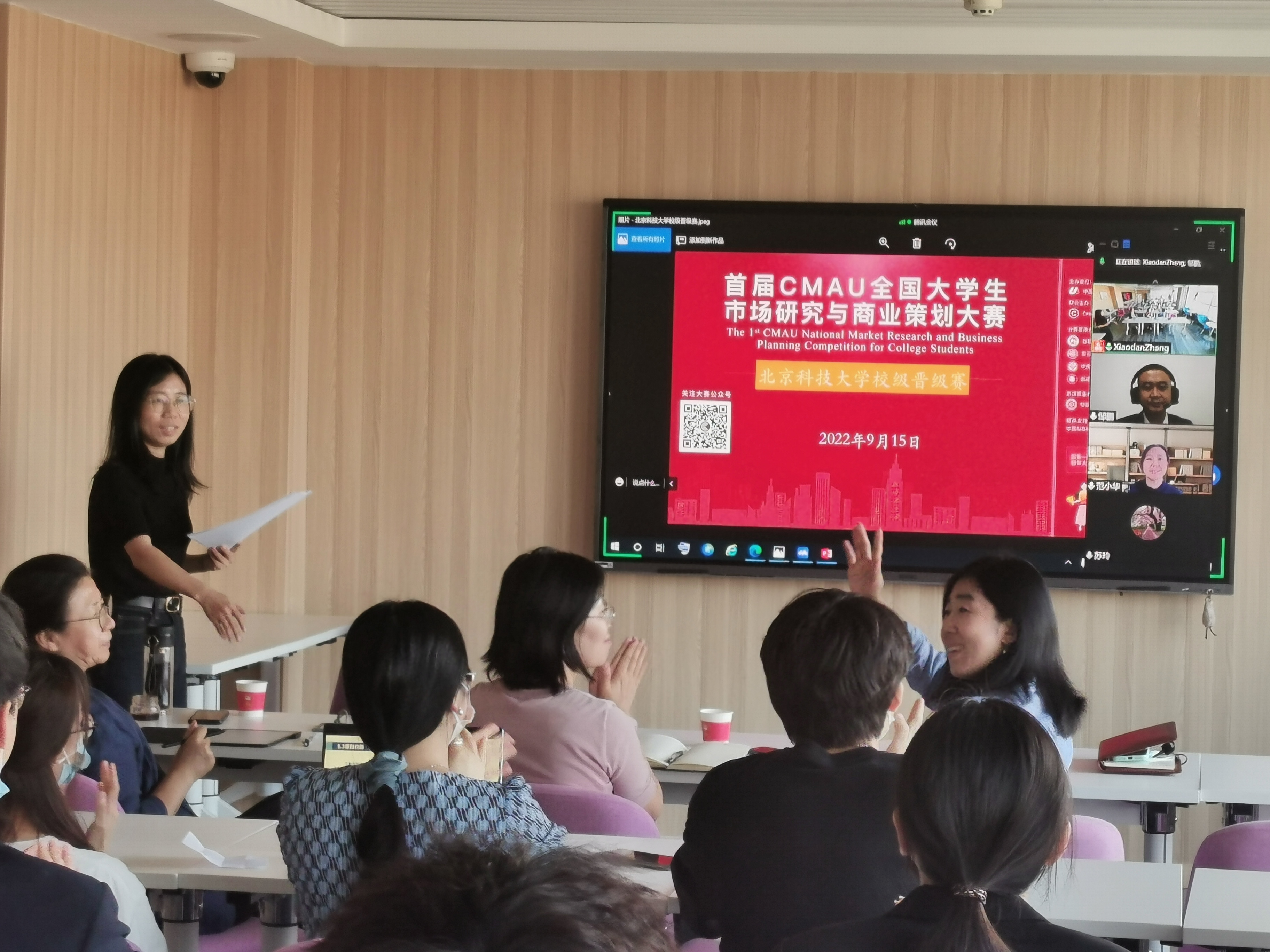 9月15日,由中国高校市场学研究会(CMAU)和Credamo见数科技公司主办,北京科技大学经济管理学院工商管理系承办的首届CMAU全国大学生市场研究与商业策划大赛北京科技大学校级选拔赛举行。本次比赛以线上线下相结合的形式进行,经济管理学院副院长范小华和工商管理系主任张剑出席本次活动并致辞发言。工商管理系老师胡玲、苏玲、姚卿、邹鹏担任评委,张晓丹老师主持。