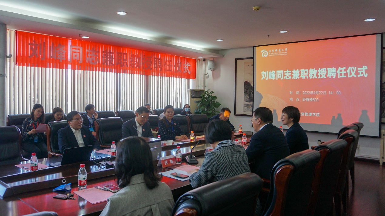 2022年4月22日下午,中国大洋协会秘书长、我校79级校友刘峰同志兼职教授聘任仪式在经管楼809举行。北京科技大学副校长闫相斌出席仪式并为刘峰校友颁发学校兼职教授聘任证书,经济管理学院党委书记武森教授主持聘任仪式。关心下一代工作委员会常务副主任孙铁,离退休职工党委副书记、离退休职工工作处副处长、关心下一代工作委员会秘书长刘淑红,经济管理学院副院长黄晓霞以及学院教师代表到场参加活动。