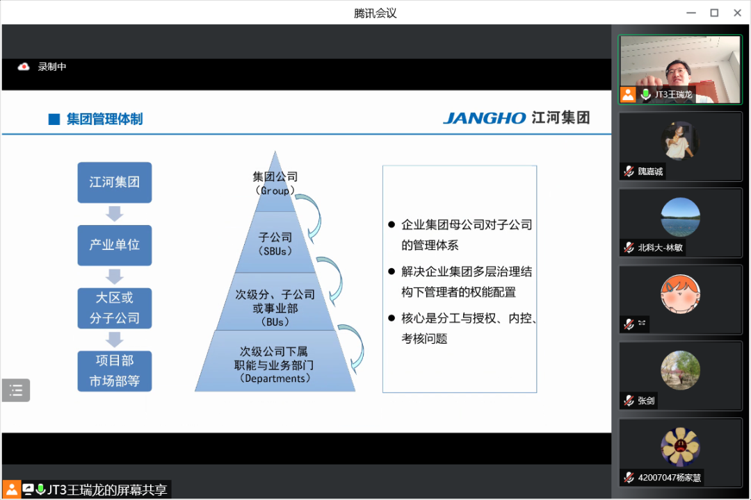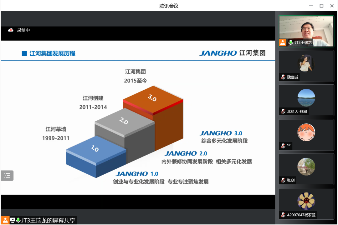 7月19日上午,江河集团行政人事总监王瑞龙应邀参加北京科技大学经济管理学院工商管理系2020级企业认识与实践的认识实习,并为同学们精心介绍江河集团的管理体系和人力资源管理模式。本次认识实习共三部分,首先是王总为同学带来主题讲座,其次由集团的部门负责人带领同学在线参观集团的北京工厂与成都公司办公环境,最后由王总与各位同学老师交流互动。工商管理系林敏老师担任主持人,工商管理系系主任张剑,何润宇、尹奎等老师与工商管理系20级全体本科生出席本次活动。