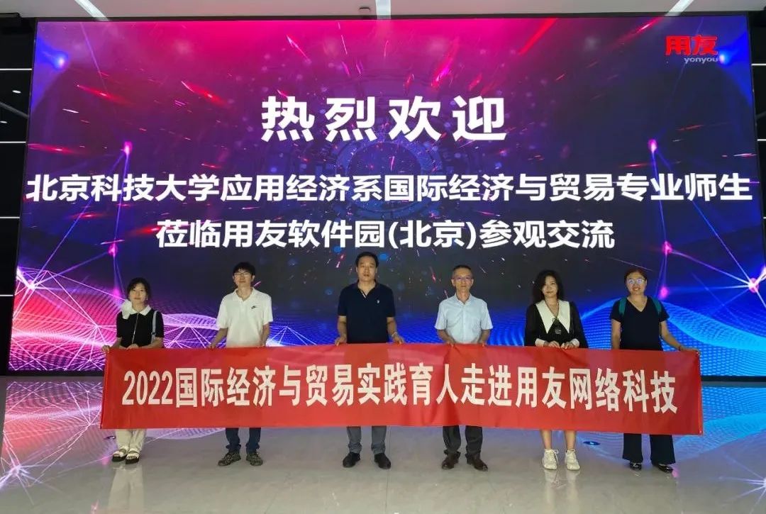 7月20日,北京科技大学经济管理学院应用经济系国际经济与贸易专业实践育人活动以线上线下相结合的方式走进用友网络科技股份有限公司,参观了用友数智企业馆。用友是全球领先的企业云服务与软件提供商,致力于用创想与技术推动商业和社会进步。此次参观的数智企业馆是我国第一家真正展现数智化全貌的综合型、融合化、生态式数智企业体验中心,是用友对过去32年企业服务方面的经验总结和对未来企业服务的展望。本次认识实习暨实践育人活动采用“线下引领+线上协同”的形式,由应用经济系副主任马建峰副教授带领应用经济系俞峰老师、李侨敏老师以及学生代表哈嘉雯、尹胜辉实地参加,由应用经济系王凯副教授带领国贸20级全体学生一起在线同步参加了此次活动,会计等专业的学生也在线上观摩,线上人数共计百余人。