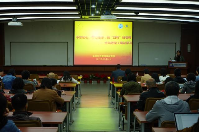 2019年10月24日星期四下午3点半,东凌经济管理学院全体教职工专题理论学习会在经管楼313举行。学院党委邀请学校纪委副书记、监察室主任兼巡察办主任吴豪伟为全体教职工作题为“不忘初心、牢记使命,做‘四有’好老师”专题教育报告,会议由学院党委书记武森主持。